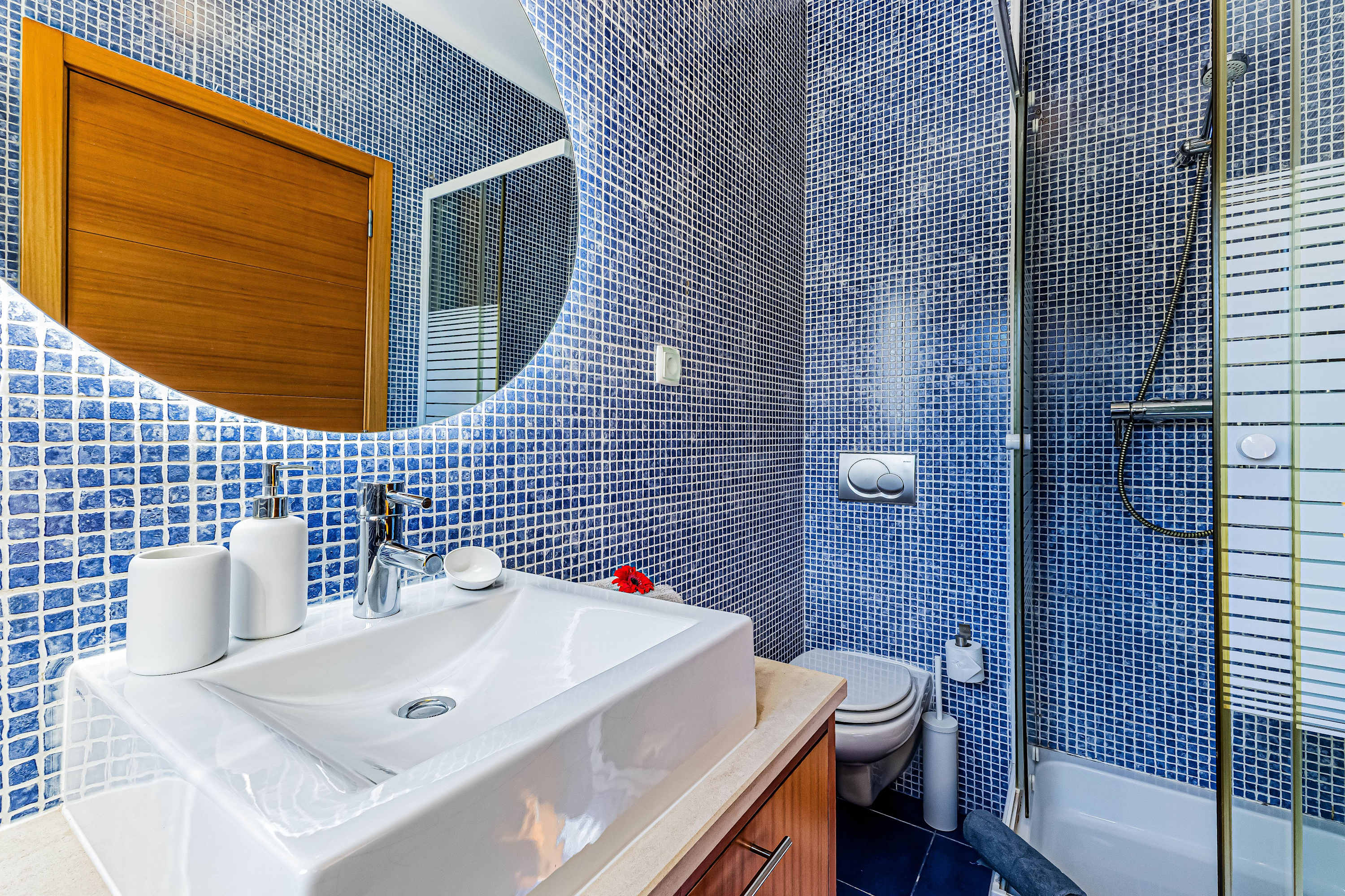 Fully equipped kitchen with all appliances: refrigerator, dishwasher, capsule coffee machine, electric kettle, juicer, complete utensils and tableware – everything you need to prepare your meals comfortably.