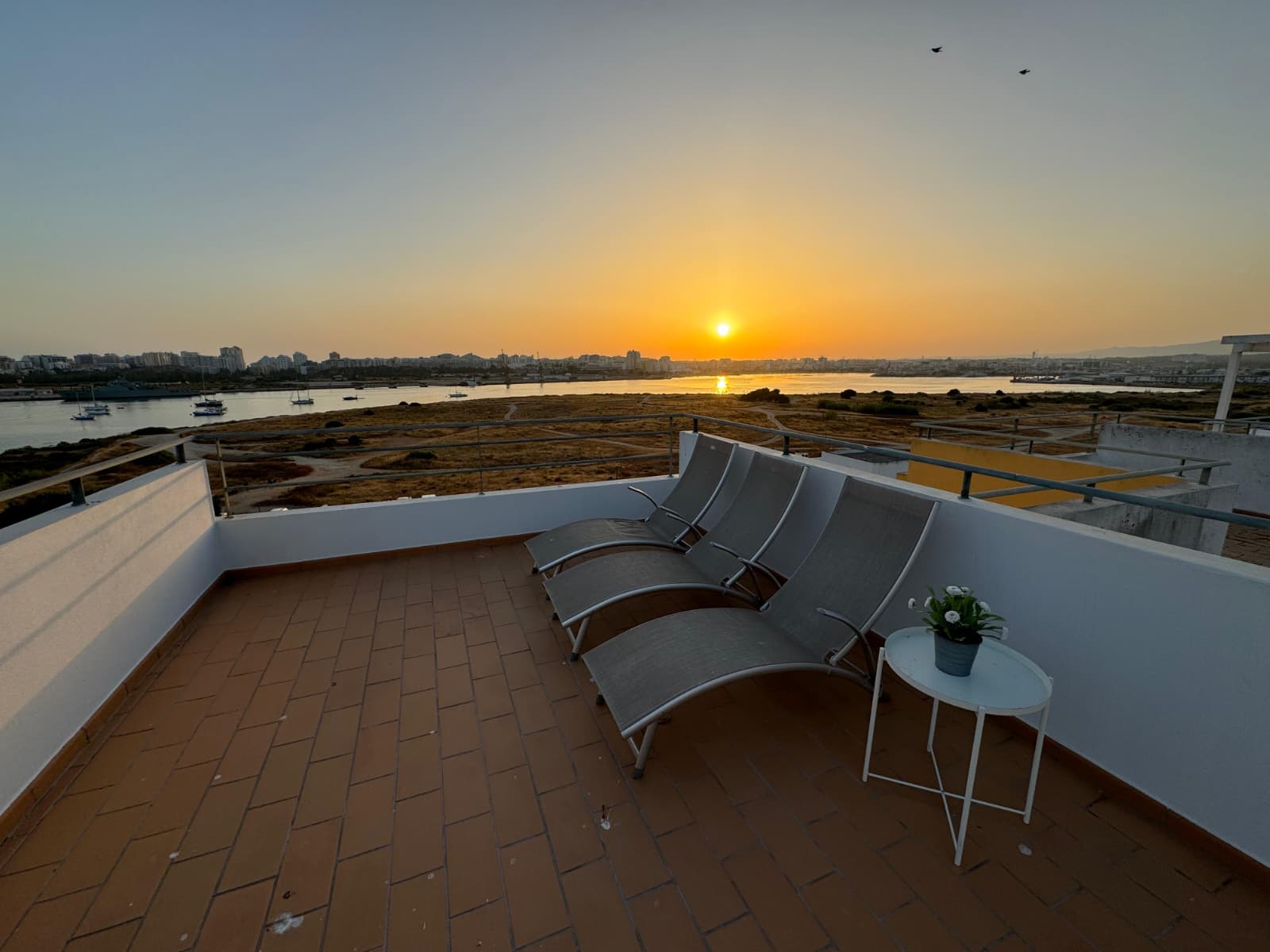 Direct access to a balcony equipped with a sofa, small table, and chairs, ideal for watching the sunrise and perhaps having breakfast with a view over the estuary.